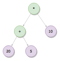 A continuación tendríamos dos hojas con los valores 25 y 10 con un nodo común con la operación multiplicar, por lo que el resultado de ambos será de 25 multiplicado por 10: 250. Al ser la raíz del árbol este sería el valor del resultado de la expresión.