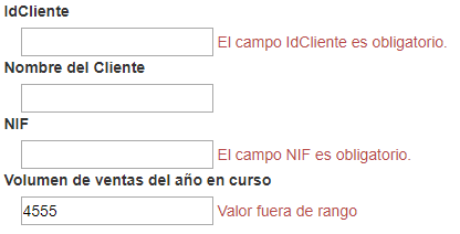 Cliente del mismo ejemplo, veamos la siguiente vista de edición: Gracias a los atributos utilizados en el modelo (DisplayName, Required, Range...) y los métodos de extensión LabelFor, EditorFor y ValidationMessageFor, los cuales aceptan un árbol de expresión como parámetro, obtenemos el código Html necesario para la representación de las etiquetas, la validación en cliente y los textos de error producidos en la validación.Este sería el código generado de forma totalmente automática para el campo de texto de IdCliente: